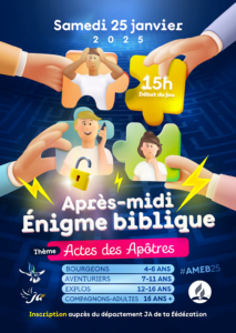 Après-midi de l’énigme biblique Veuillez activer JavaScript dans votre navigateur pour remplir ce formulaire.Coordonnées : *PrénomNomEmail *Mon adresse postale :Mon groupe / Mon église : *J'inscris mon groupe dans la catégorie : BourgeonsAventuriersExplorateursCompagnons/AdultesSubmit + Ajouter à mon Agenda Google + iCal / Outlook export Date Jan 25 2025 Expiré! Heure 15h00 - 18h15
